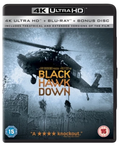 | Edition | Interactive Menus\Bonus Footage\Trailers\Deleted Scenes\Commentary: Blu-Ray: Ridley Scott (Director); Jerry Bruckheimer (Producer); Mark Bowden (Author); Ken Nolan (Writer); Task Force Ranger Veterans\Other Documentary: Blu-Ray: 'The Essence of Combat'; 'The History Channel Presents: 'The True Story of Black Hawk Down''; 'PBS Presents: 'Frontline: Ambush in Mogadishu'';'Designing Mogadishu'; Ridleygrams; (with commentary); ;Target Building Insertion' (with commentary); Title design explorations (with commentary\Bonus Tracks: Blu-Ray: Gortoz A Ran – J'Attends by Denez Prigent & Lisa Gerrard |